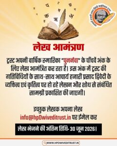 ट्रस्ट अपनी वार्षिक स्मारिका “पुनर्नवा” के पाँचवें अंक के लिए लेख आमंत्रित कर रहा है। इस अंक में ट्रस्ट की गतिविधियों के साथ-साथ आचार्य हजारी प्रसाद द्विवेदी के व्यक्तित्व एवं कृतित्व पर हो रहे लेखन और शोध से संबंधित सामग्री प्रकाशित की जाएगी।