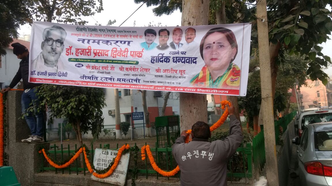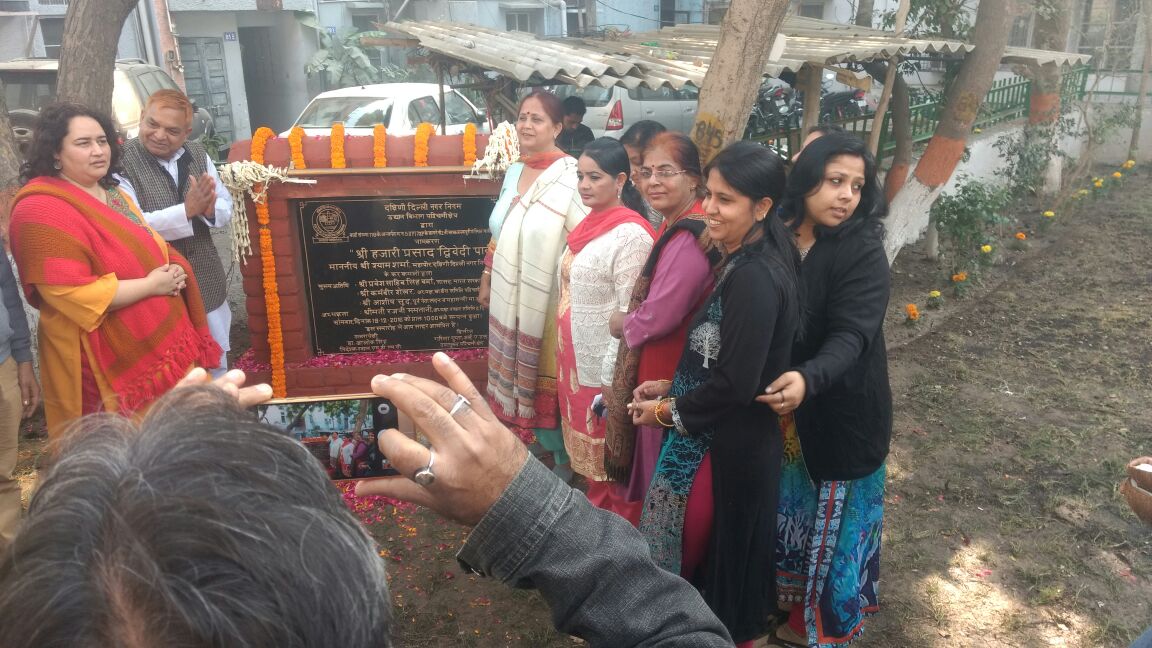दक्षिण दिल्ली नगर निगम ने प्रसिद्ध साहित्यकार डॉ हजारी प्रसाद द्विवेदी के नाम पर एक पार्क का नामकरण किया।19 दिसंबर 2016 में पश्चिमी दिल्ली के जनकपुरी ब्लॉक सी2बी में स्थित पार्क के गेट पर डॉ हजारी प्रसाद द्विवेदी के नाम का शिलापट्ट लगा कर वार्ड समिति के चेयरमैन कर्मवीर शेखर और स्थानीय पार्षद रजनी ममतानी ने इस पार्क का उद्धाटन किया।
