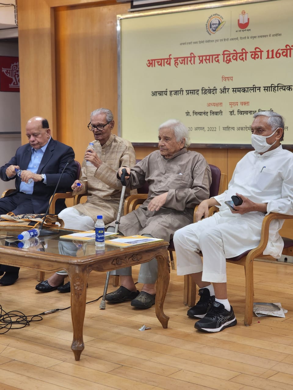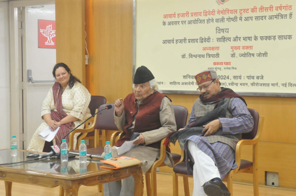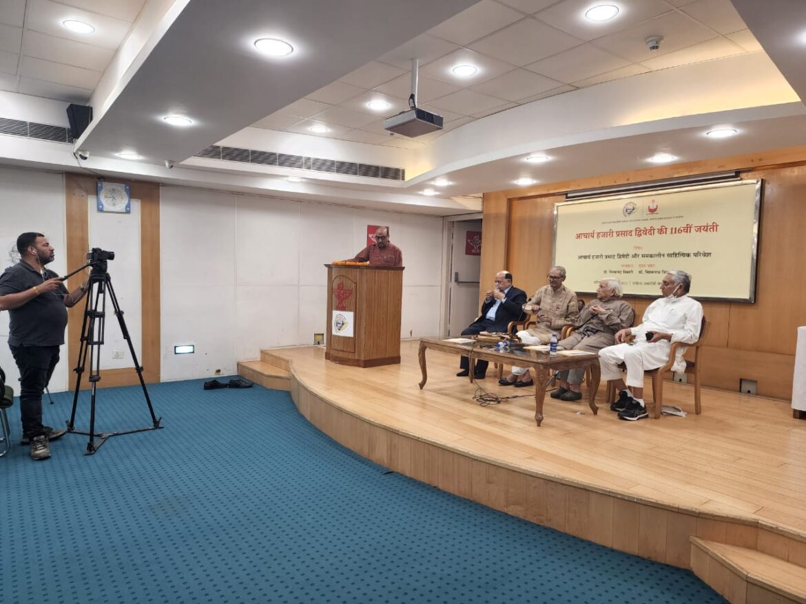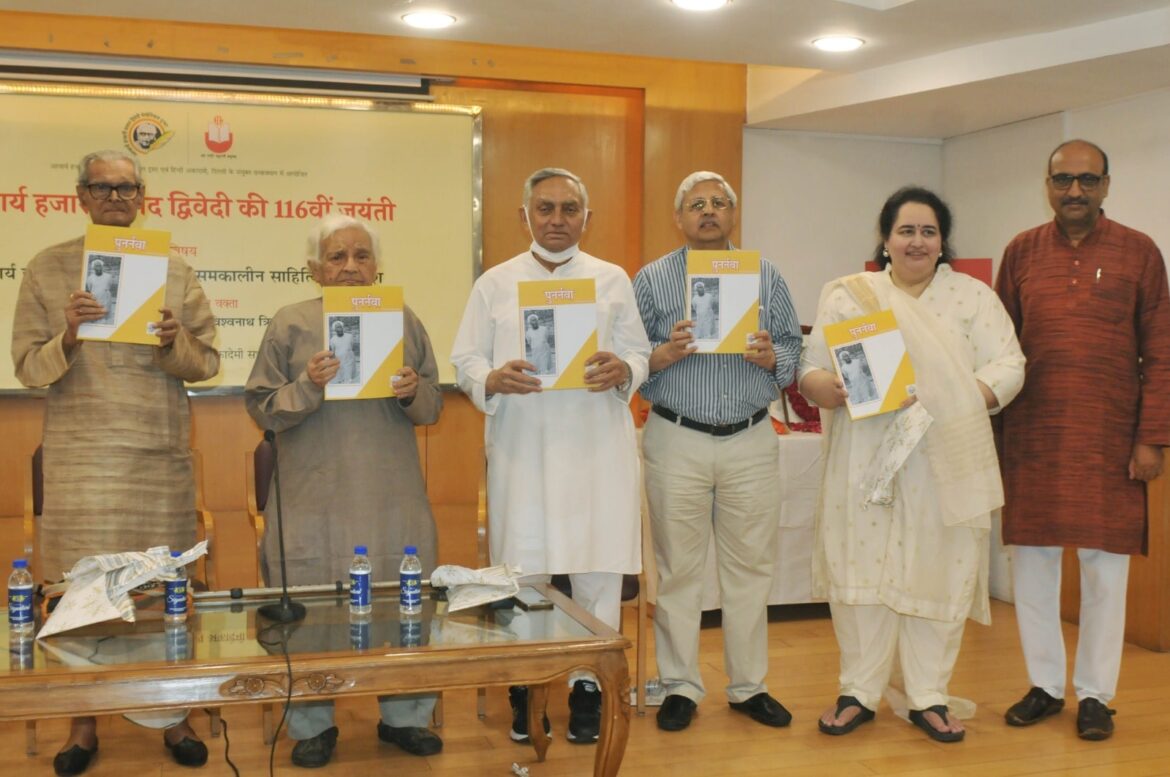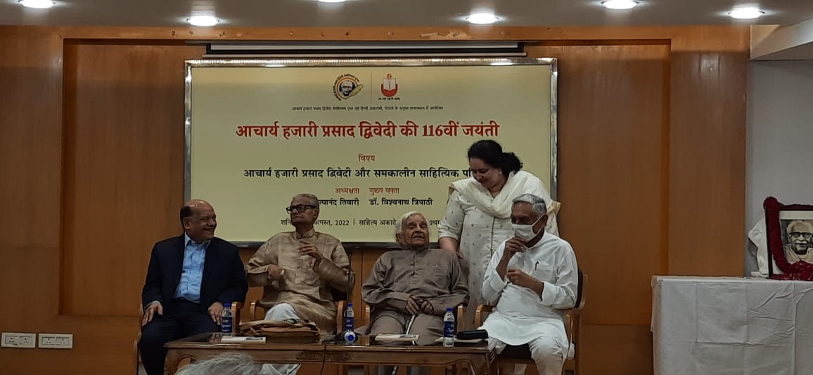 आचार्य हजारी प्रसाद द्विवेदी की 116वीं जयंती के अवसर पर शनिवार को आचार्य हजारी प्रसाद द्विवेदी मेमोरियल ट्रस्ट और हिंदी अकादमी, दिल्ली सरकार के संयुक्त तत्वावधान में साहित्य अकादमी के सभागार में गोष्ठी का आयोजन किया गया जिसमें डॉ विश्वनाथ त्रिपाठी मुख्य वक्ता के रूप में मौजूद थे जबकि हिंदी साहित्य के वरिष्ठ आलोचक प्रो. नित्यानंद तिवारी ने गोष्ठी की अध्यक्षता की । कार्यक्रम के आरंभ में कार्यक्रम के आरंभ में ट्रस्ट द्वारा प्रकाशित स्मारिका “पुनर्नवा” का विमोचन भी किया गया। इस मौके पर पूर्व सांसद एवं प्रसिद्ध हिंदीसेवी जनार्दन द्विवेदी, विख्यात व्यंग्यकार पद्मश्री सुरेंद्र शर्मा और राजकमल प्रकाशन के प्रमुख अशोक माहेश्वरी भी मौजूद थे।