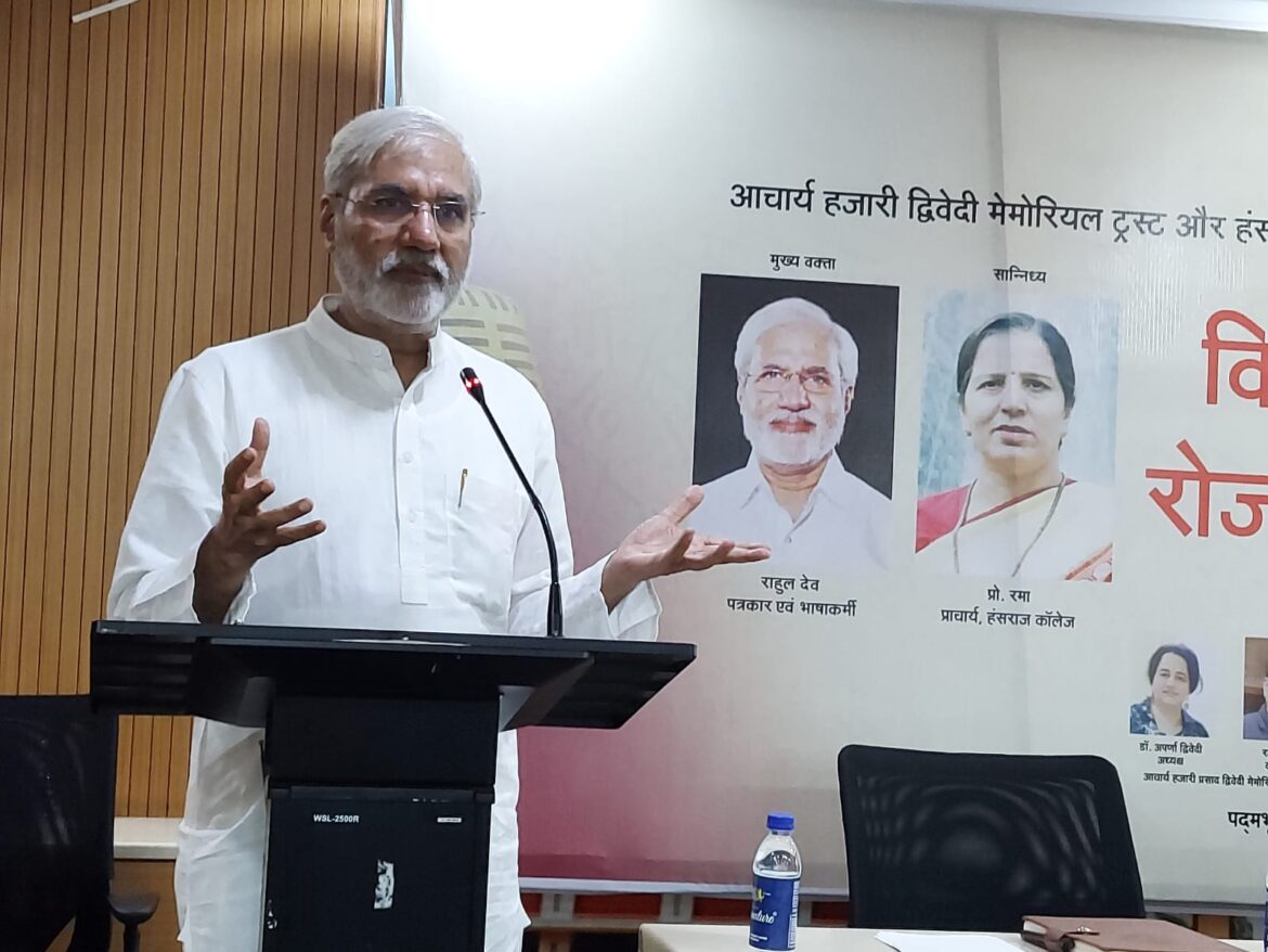 दिल्ली विश्वविद्यालय के उत्तरी परिसर में स्थित हंसराज कॉलेज के पद्मभूषण ज्ञान प्रकाश संगोष्ठी कक्ष में बुधवार को “हिंदी रोजगार की भाषा” विषय पर आयोजित संगोष्ठी को राहुल देव मुख्य वक्ता के रूप में संबोधित कर रहे थे। यह परिचर्चा आचार्य हजारी प्रसाद द्विवेदी मेमोरियल ट्रस्ट और हंसराज कॉलेज के संयुक्त तत्वावधान में आयोजित की गई थी। इस पर चर्चा में पत्रकार एवं भाषाकर्मी राहुल देव के अलावा कालेज की प्राचार्य प्रोफेसर रमा, टीवी पत्रकार संगीता तिवारी एवं वाणी प्रकाशन की प्रबंध निदेशक अदिति माहेश्वरी गोयल मौजूद थीं। कार्यक्रम के आरंभ में आचार्य हजारी प्रसाद द्विवेदी मेमोरियल ट्रस्ट की अध्यक्ष डॉ अपर्णा द्विवेदी ने अतिथियों का स्वागत किया और ट्रस्ट की प्राथमिकताओं के बारे में बताया। उन्होंने कहा कि यह ट्रस्ट शिक्षा, भाषा, साहित्य, पर्यावरण के क्षेत्र में प्रमुखता से कार्य कर रहा है और निकट भविष्य में इसकी और भी कई योजनाएं हैं।