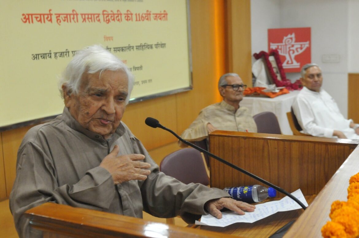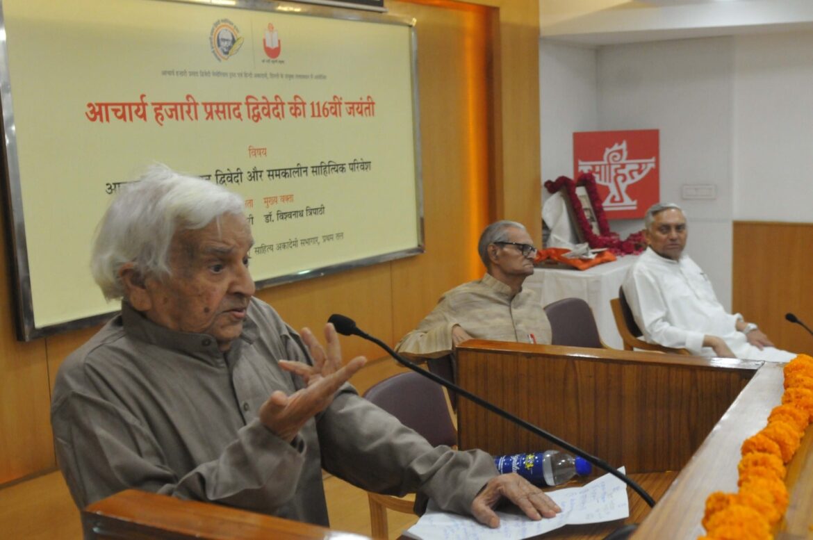 नई दिल्ली। आचार्य हजारी प्रसाद द्विवेदी का व्यक्तित्व और उनका साहित्य दोनों भारतीय संस्कृति के प्रतीक हैं। मध्यकालीन साहित्य की व्याख्या करते हैं व आधुनिकता और परंपरा को समझाते हैं। अपने समय के मनुष्य को साहित्य से गठने का प्रयास करते हैं। यह सब करते हुए वे समाज के सबसे निम्न वर्ग और वर्ण के व्यक्ति, वंचित और शोषित को नहीं भूलते। यह कहना है हिंदी के वरिष्ठ आलोचक, कवि व गद्यकार डॉ विश्वनाथ त्रिपाठी का।